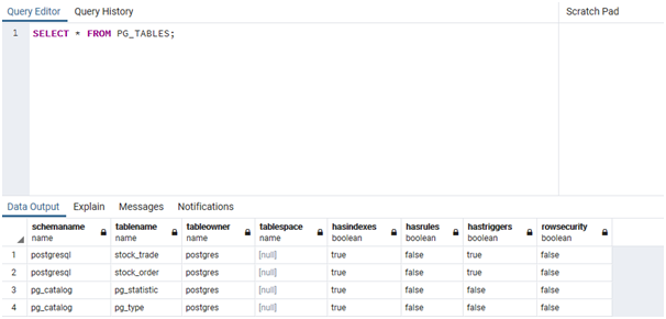 schemaname이 postgresql인 것에 우리가 만든 테이블 stock_order, stock_trade이 있다. 필자가 스키마 이름을 postgresql로 지정했기 때문이다.