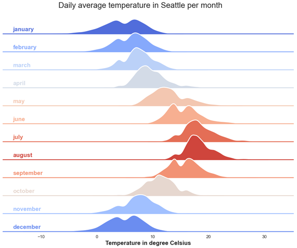 여러 그룹에 대한 숫자 값의 분포를 보여주는 차트이다. 히스토그램을 수평으로 여러 개 중첩한 모양이다.
