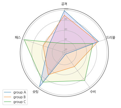 방사형 그래프는 특정 대상-주요 변수의 상대적인 관계를 나타낼 때 주로 사용한다.